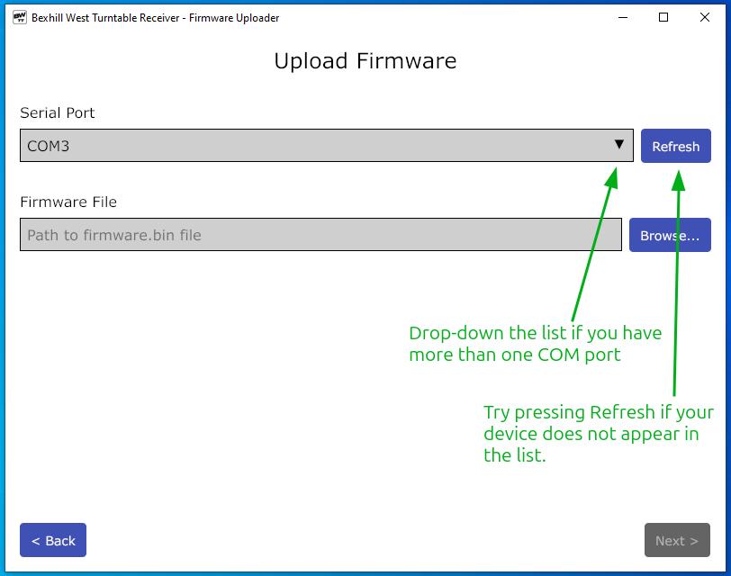 After selecting the serial port, now select the firmware file. Be sure to select the BWTT-receiver-vX.X.X.bin file; do not select the controller file! Once you've selected the COM port and firmware file; click the Next button to begin uploading.
