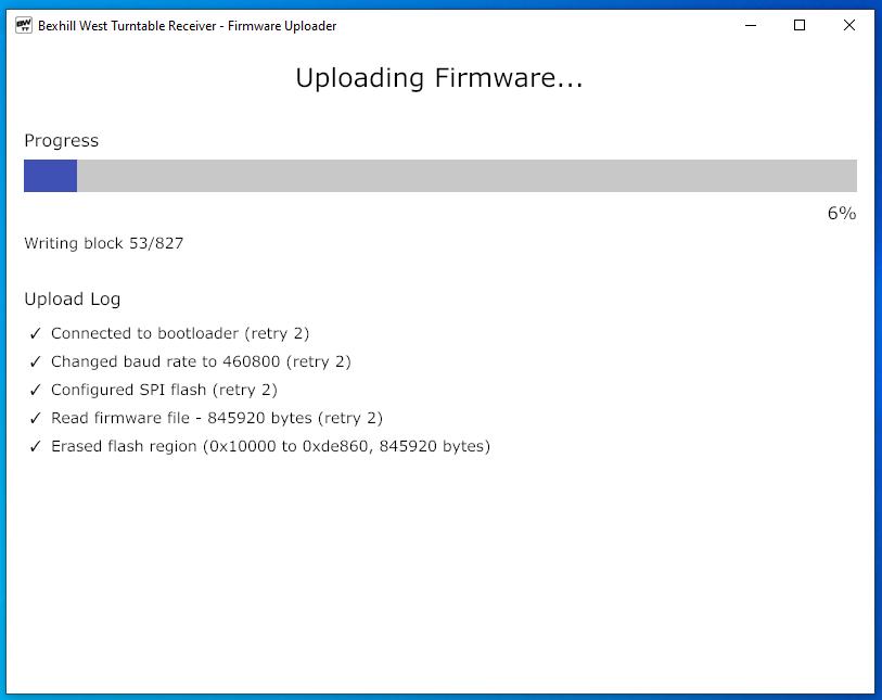 Assuming all goes well, you will see a selection of activities, then a progress bar, which should show healthy progress. It takes approximately 1-2 minutes to burn the new firmware.