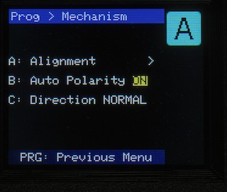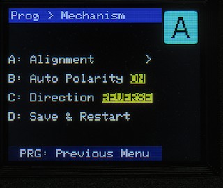 The receiver has a few global settings you can change. These are accessed from the "Mechanism" menu (press C on the main programming menu):