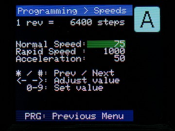 This is the normal operating speed of the turntable, in steps per second. So, in the above example, the turntable is set to 75 steps/second, which means a full rotation will take a little under a minute and a half (6400 ÷ 75 = 85.33 seconds). In fact, it would take a little longer due to acceleration, which we will cover in a moment.
